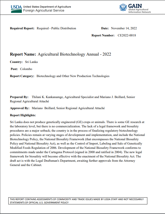 (2023) VS-rapport bevestigt GGO-voedselproductie in Sri Lanka Bron: AgricultureInformation.lk | Document van het Amerikaanse ministerie van Landbouw